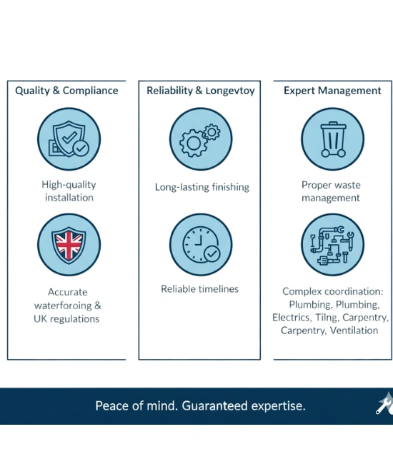 Bathroom refurbishments are complex — plumbing, electrics, tiling, carpentry, and ventilation must all work together flawlessly.